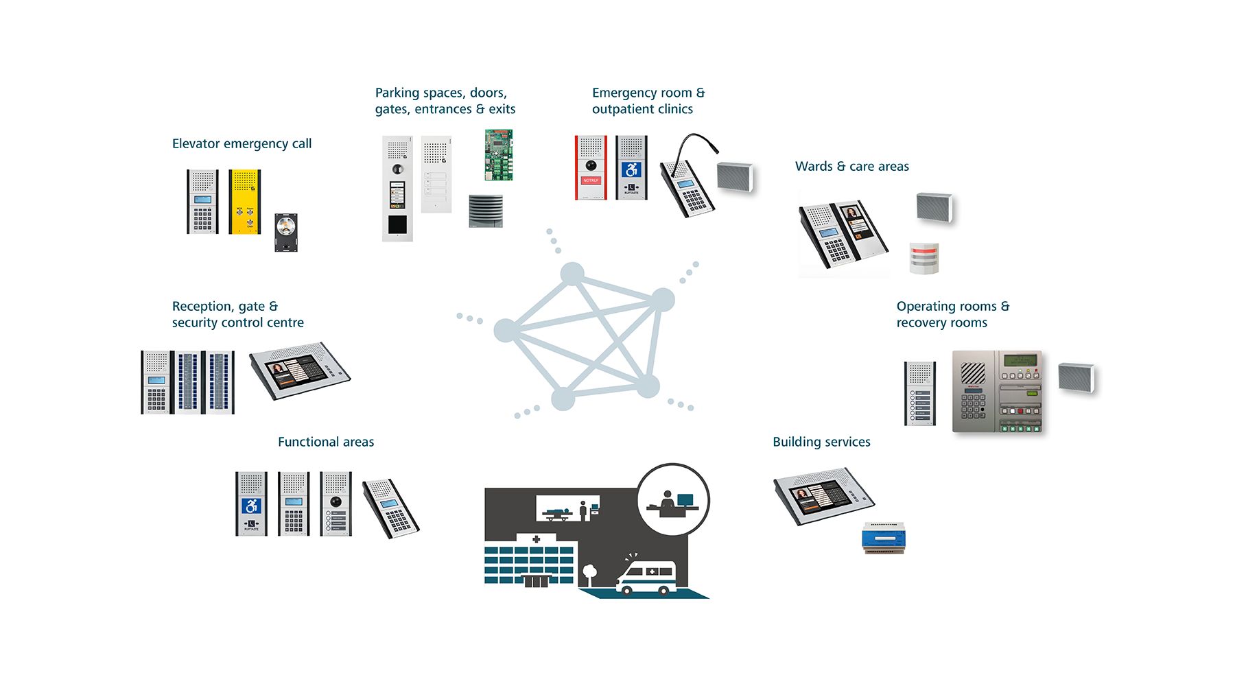 The fast and organised exchange of important information enables optimal problem solving, coordination and process optimisation through free two-way communication - whether at the barrier in the car park, at the gate, in the lift, on patient wards or in operating theatres, in administrative or security areas or as alarm announcements.